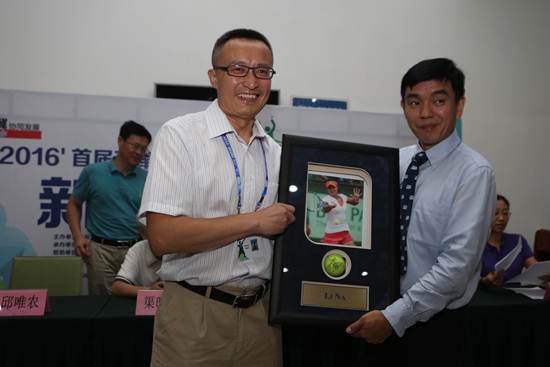 “这是我珍藏多年李娜的亲笔签名网球,这次拿出来赠送给石家庄君乐宝乳业有限公司总裁魏立华先生,感谢他对本次大赛的支持。”河北省网球协会副主席樊建军说。