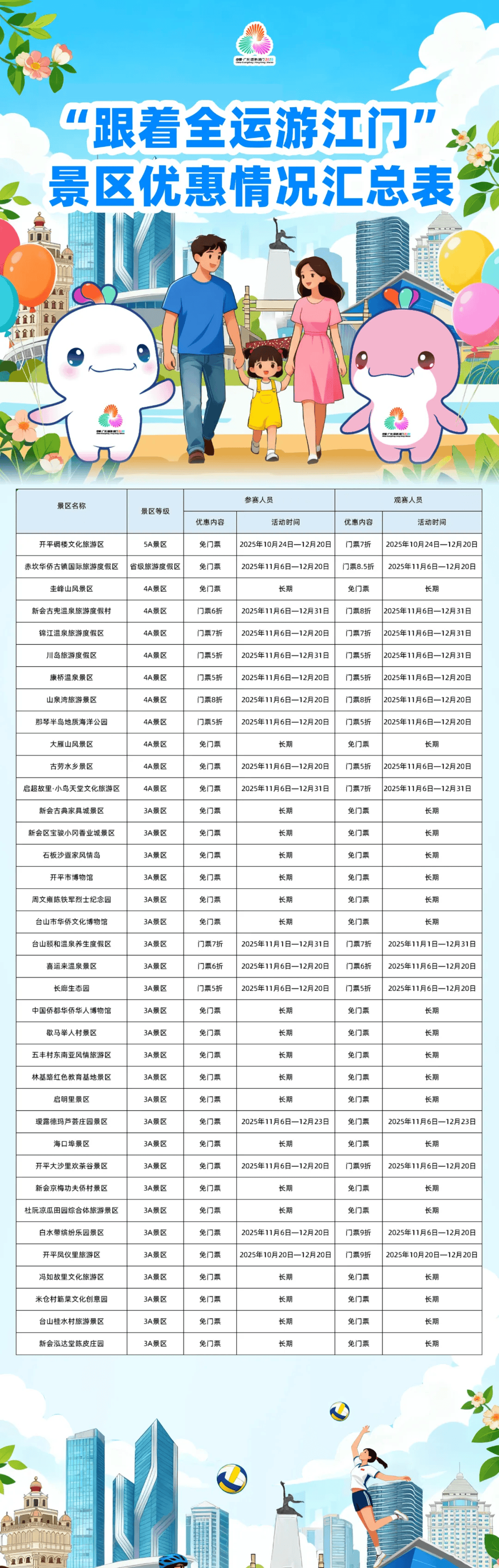 值得一提的是,江门也于本月同步启动“畅游五邑·乐购侨都”消费季,推出“跟着全运游江门”等四大主题活动,策划多条赛事旅游线路,推动“体育+文旅”深度融合。聚焦游客关切,江门还推出六大优惠礼包,其中“优惠进景区”措施尤为亮眼:参赛人员和观众可在全市37家重点景区享受首道门票免费或折扣,入住指定酒店和民宿也可获得专属礼遇。这些实实在在的福利,与赛事活动形成联动,将有效助推消费市场升温。