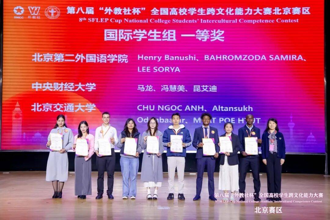 近日,第八届“外教社杯”全国高校学生跨文化能力大赛(北京赛区)举办,我校首次参赛便斩获佳绩:几内亚比绍籍学生马龙、昆艾迪与柬埔寨籍学生冯慧美组成的代表队获国际学生组一等奖,何哲泰、侯静菡、欧阳子昊组成的中国学生组获三等奖,原绍锋、王琳老师获评“优秀指导教师奖”。