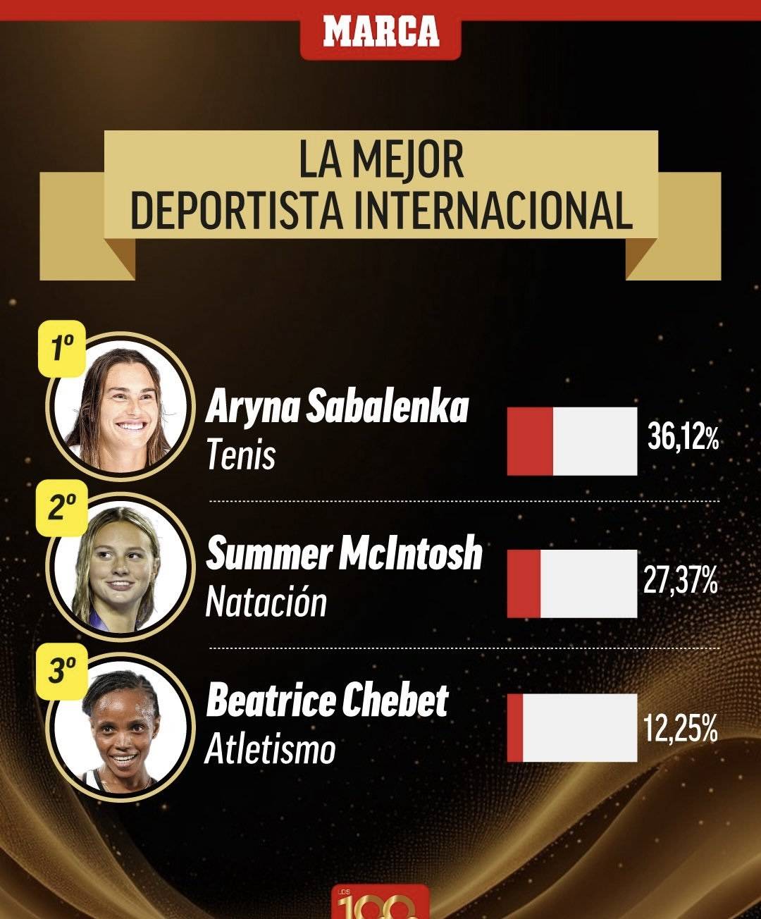 在国际女子运动员类别中,现世界排名第一的萨巴伦卡凭借2025赛季的稳定发挥和多项重要赛事冠军,成功当选年度最佳女子运动员。她的得票率领先于加拿大游泳天才夏季·麦金托什和肯尼亚长跑名将比阿特丽斯·切贝特。