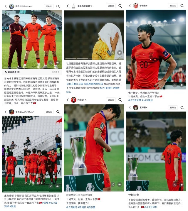 赛后,U23国足队员在社交媒体表达了自己在赛后五味杂陈的情绪。“计划未竟,但会一直战斗下去!”是这群创造历史的青年球员最大的感受之一。