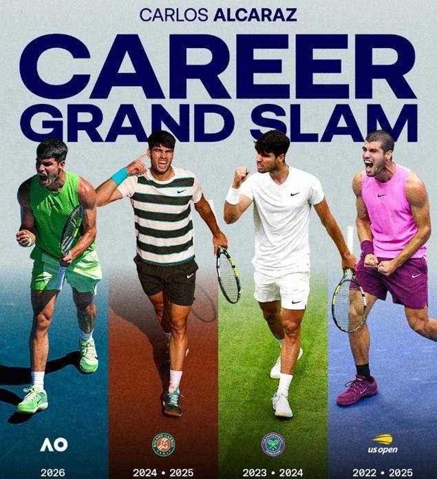 网球联赛,ATP赛程,WTA积分,网球直播入口,网球世界排名,四大满贯赛/实时更新全球网球联赛2025赛程、比分、排名及直播,全面覆盖ATP男子联赛、WTA女子赛事、四大满贯及国内网球比赛,为中文网球迷提供权威资讯与竞猜预测支持。北京时间2月1日晚,墨尔本罗德·拉沃尔球场的璀璨灯光下,一场注定载入史册的巅峰对决画上了句号。经过近三个半小时的鏖战,新生代领军者卡洛斯·阿尔卡拉斯在先失一盘的局面下,展现出了超越年龄的沉稳与强悍,连扳三盘逆转击败了24座大满贯得主诺瓦克·德约科维奇,职业生涯首度加冕澳网冠军。此战胜利,也让他成功集齐四大满贯奖杯,跻身“全满贯”传奇行列。