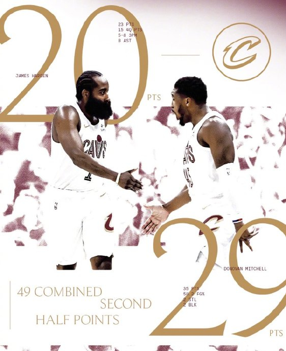 哈登此役贡献22分10篮板7助攻4盖帽,末节攻防一体,尤其命中扳平三分(生涯最后24秒关键球命中率50%),展现老将控场与抗压能力。米切尔则专注终结端,全场32分10助攻,末节主动要球造犯规罚球绝杀,凸显新生代在高压下的果敢与效率。二人未合练即形成“哈登破僵+米切尔收割”的默契分工,打破传统巨星大包大揽的模式。