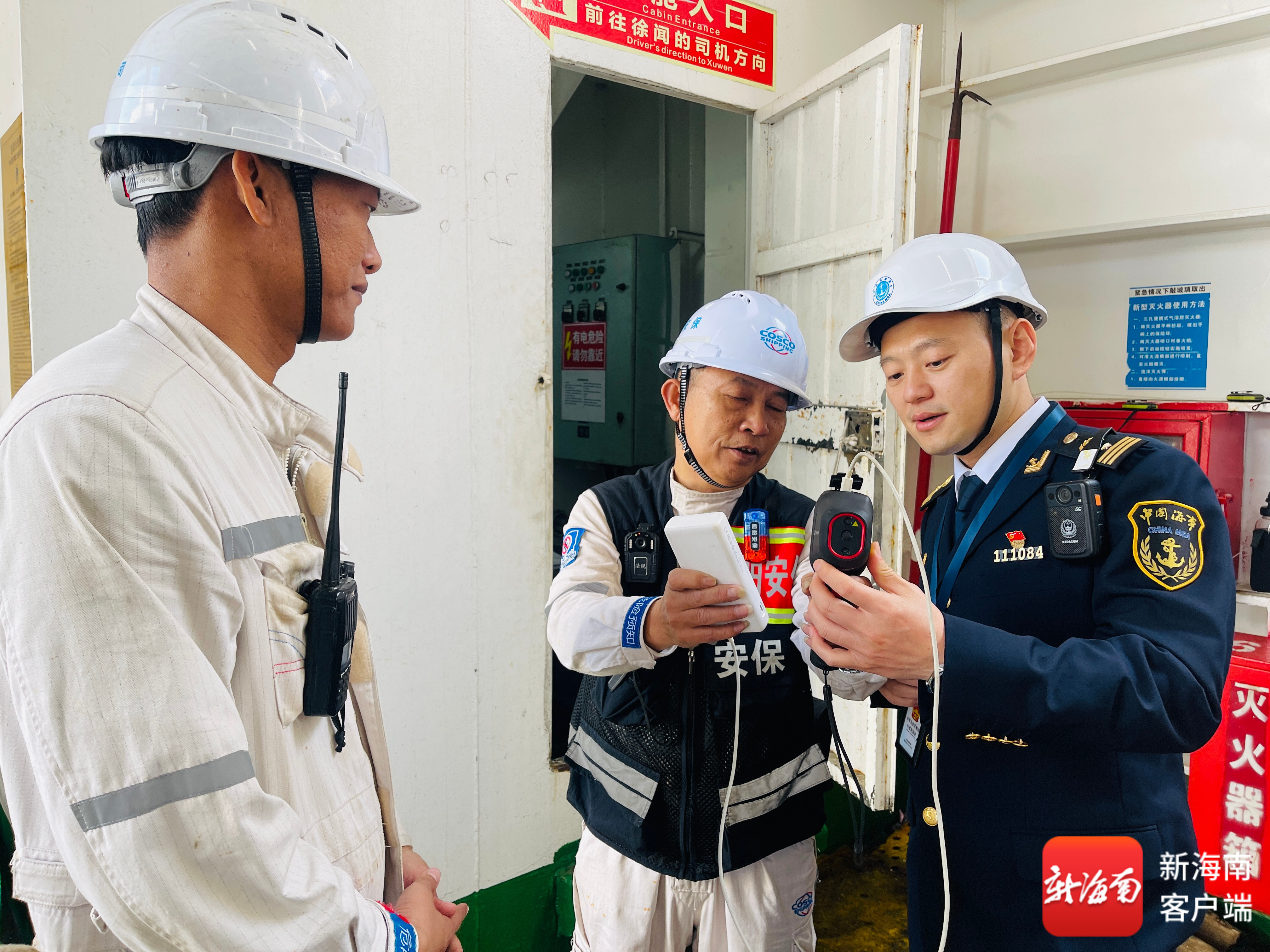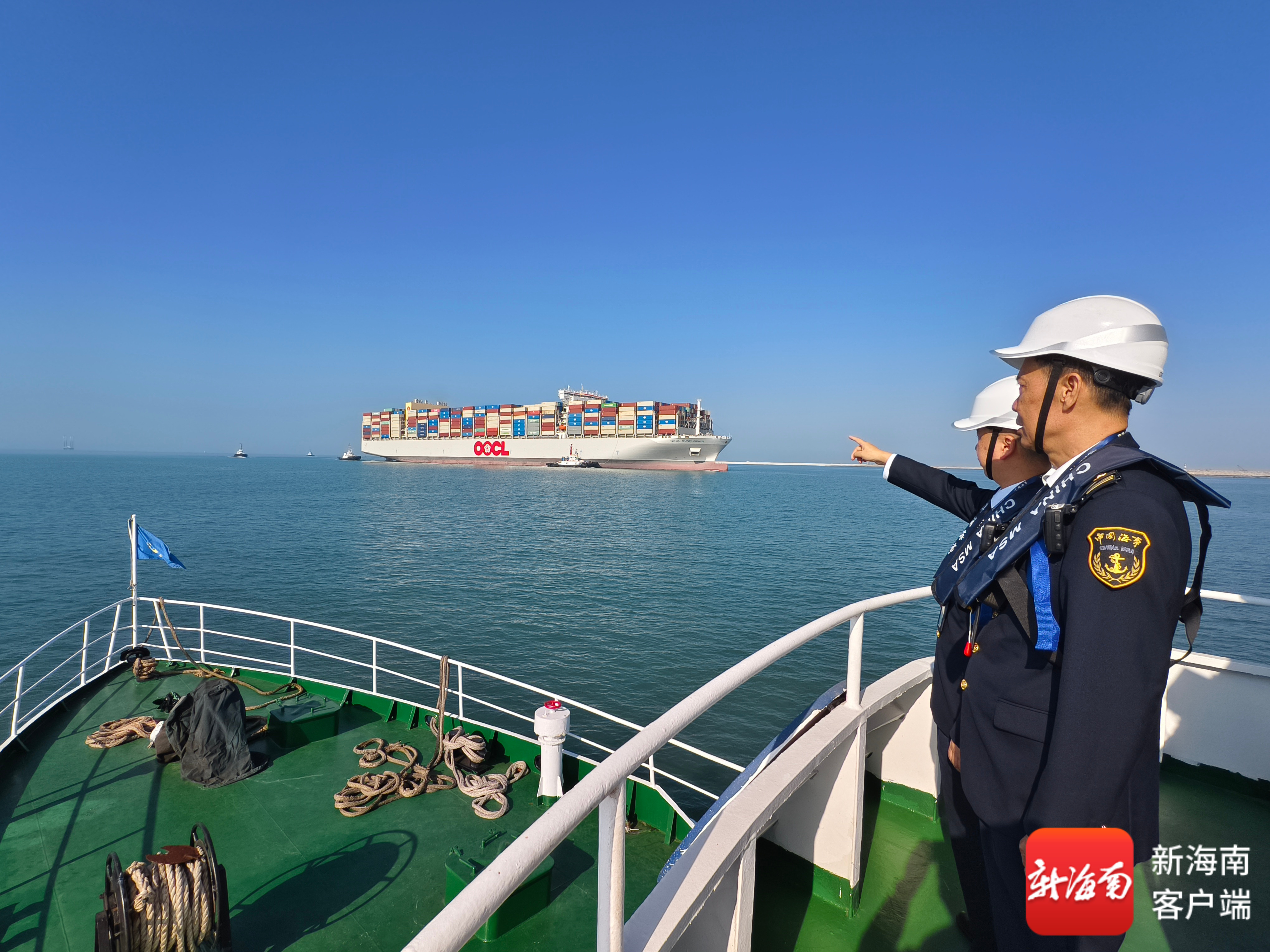 海南洋浦国际集装箱码头,海事执法人员保障重点物资运输船舶靠港安全。海南海事局供图