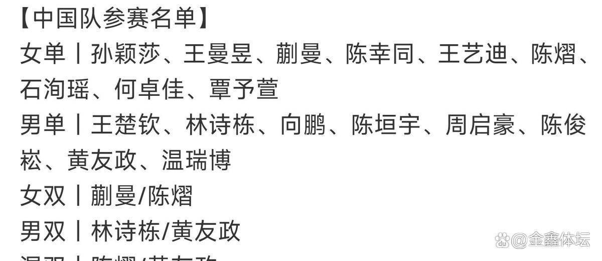 然而,与豪华的单打名单形成鲜明对比的,是双打项目的“精简”与“革新”。 国乒在三个双打项目上,每个项目都只报名了一对组合,而且全部启用了年轻选手。 男双项目,由林诗栋搭档黄友政出战。 女双项目,组合是蒯曼和陈熠。 混双项目,则继续由黄友政和陈熠配对。 这份双打名单直接导致了一个结果:2004年出生的陈熠和2005年出生的黄友政,需要在新加坡身兼单打、双打、混双三项比赛。
