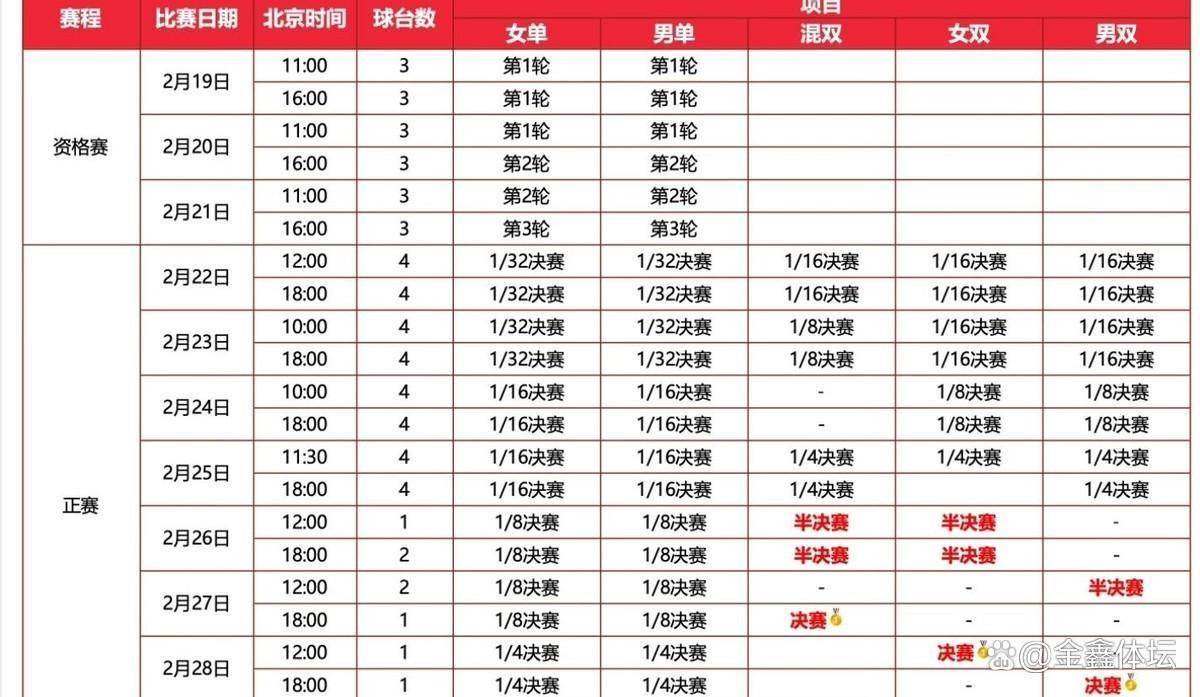 赛程安排非常紧凑。2月19日至21日,是为期三天的资格赛。比赛每天分午间场和晚间场进行。 由于国乒选手世界排名较高,全部直接晋级正赛,因此在这三天并不会亮相。 正赛阶段从2月22日,也就是大年初六正式开始。 2月22日中午12点,将进行单打1/32决赛以及混双24进16的比赛。 2月23日,进行单打1/16决赛以及双打24进16的比赛。 2月24日,进行单打1/8决赛以及双打16进8的比赛。
