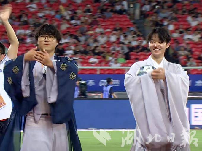 开幕当天,4万余名球迷来到现场,16支城区代表队与8支高校代表队逐一亮相。其中,汉阳队全员30余人一出场,便吸引了不少目光——走在队伍最前面的是穿越千年而来的“伯牙子期”,携知音共赴绿茵之约。