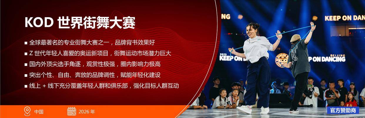 KOD全称KEEP ON DANCING,与英国的UK-BBOY、法国的JUSTE DEBOUT和德国的BOTY被业内共称为“国际四大赛事”,是中国最权威、最专业、最具影响力的街舞赛事,也是国际上参与度和关注度最高的街舞赛事品牌之一。