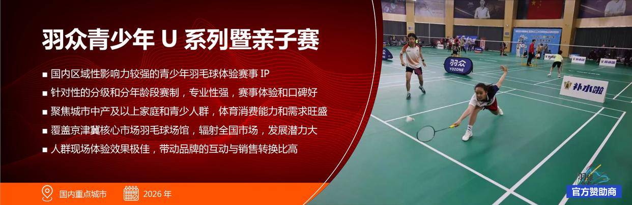 羽众是专注于羽毛球运动细分市场,以移动互联网技术及智能设备为依托,以整合营销手段精准实现品牌诉求,创造快乐激情且富有人文关怀的羽毛球赛事体验,打造产业链上下游及资源合作方的利益共享平台。羽众青少年U系列暨亲子赛聚焦青少年和家庭消费,家长普遍位于35-45岁年轻段,超过40%的家长每年在羽毛球运动的消费金额在1000元-3000元的区间,是吸引高净值消费群体的优质IP。