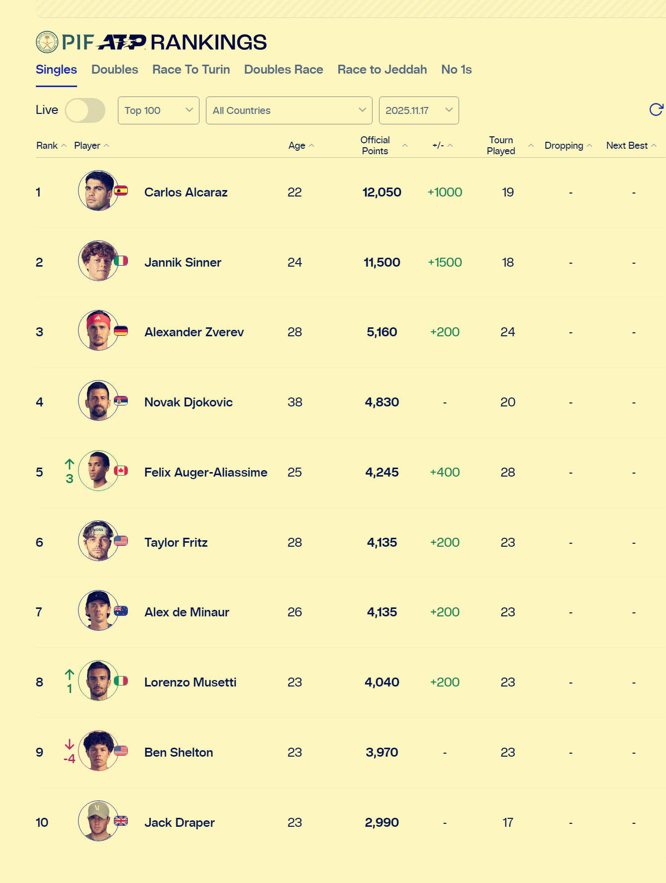 其中,在都灵打进半决赛的加拿大名将阿利亚西姆首次跻身TOP5,创下职业生涯新高。而弗里茨则因为同胞谢尔顿年终总决赛三战皆负小组赛垫底,得以重返美国一哥的位子。