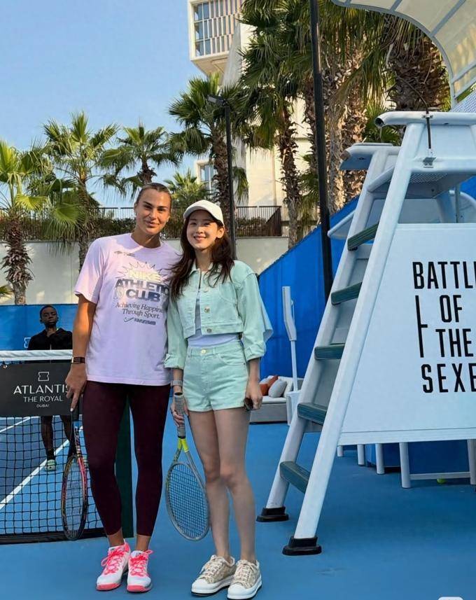 在画面中,她可能身穿清爽的薄荷绿色套装,与网球名将阿丽娜·萨巴伦卡共同出现在同一画面中