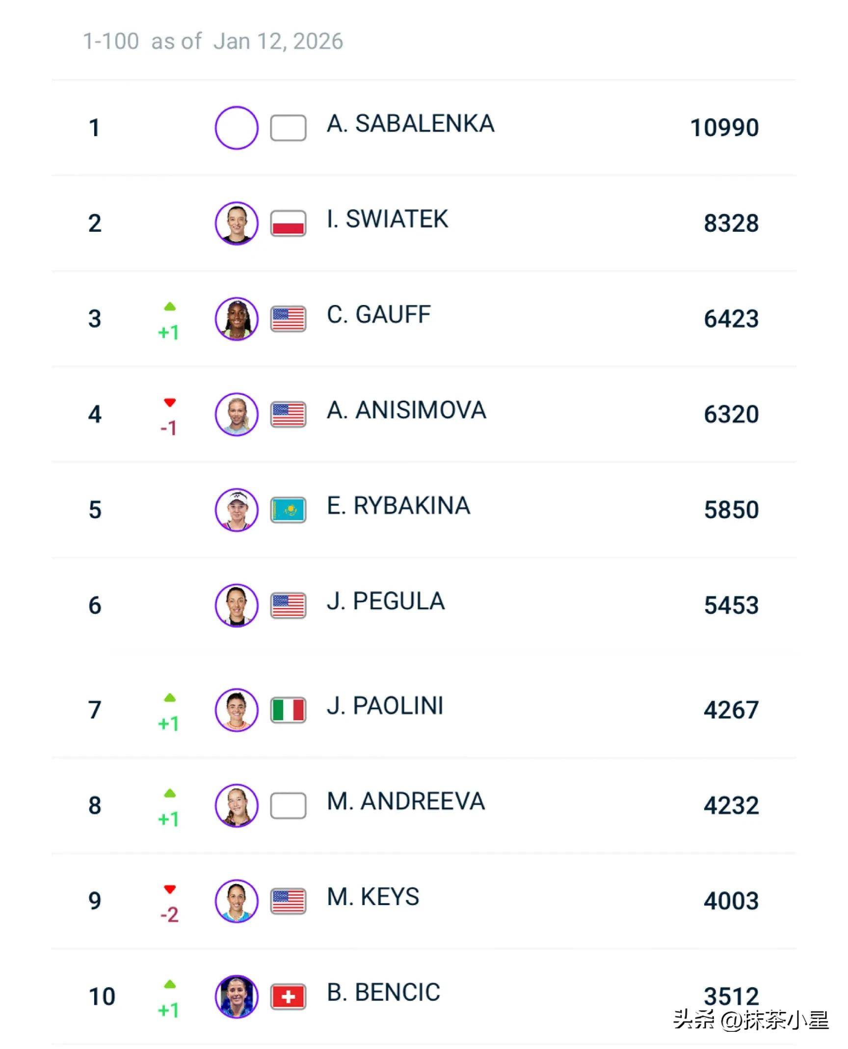首先来看TOP10球员的排名变化,刚刚在WTA500布里斯班站卫冕的萨巴伦卡,依然稳居世界第1,继续保持着和斯瓦泰克大概2000分的差距!高芙则在丢掉世界第3宝座仅仅一周后就反超阿尼西莫娃,将“美国一姐”紧紧攥在自己手中!