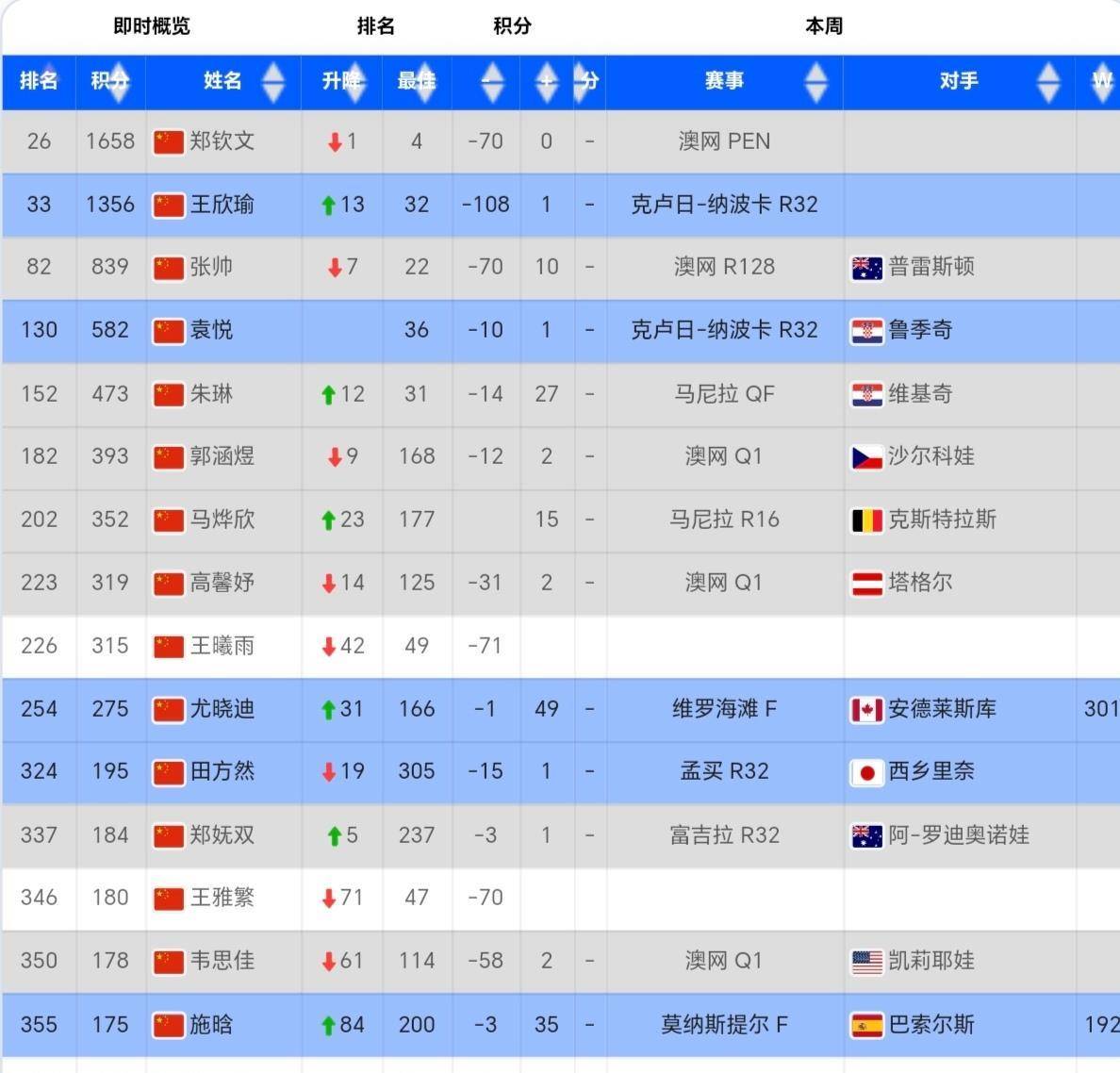 咱们中国金花这边,心情是五味杂陈。 郑钦文,原本是大家寄予厚望的“一姐”。 可惜啊,右肘的老伤没好利索,只能含泪退出澳网。 这一退,去年同轮次那70个积分就没了,排名跟着往下掉,现在定格在世界第26位。 好在,她还是守住了国内一姐的位置,身后的王欣瑜还没能追上来。