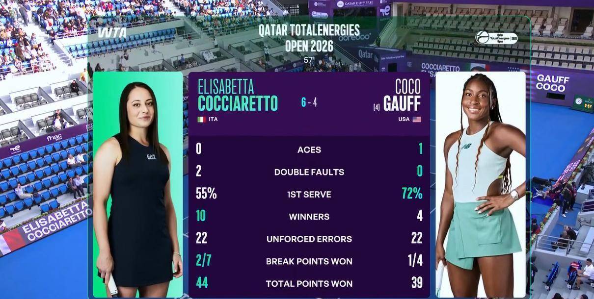 放眼多哈站的其他比赛,冷门不断涌现。世界排名第五的美国新星高芙,面对排名仅第57位的幸运落败者科恰雷托,在首盘3-1领先的大好局面下竟连丢五局,最终以4-6、2-6的比分爆冷出局,这已是她连续第三年在多哈站首战失利。此外,6号种子鲍里妮以4-6、2-6不敌萨卡里,8号种子亚历山德洛娃同样连丢两盘败给奥斯塔彭科,萨卡里、奥斯塔彭科和科恰雷托均以6-4、6-2的相同比分淘汰了各自对手,更增添了比赛的戏剧性。