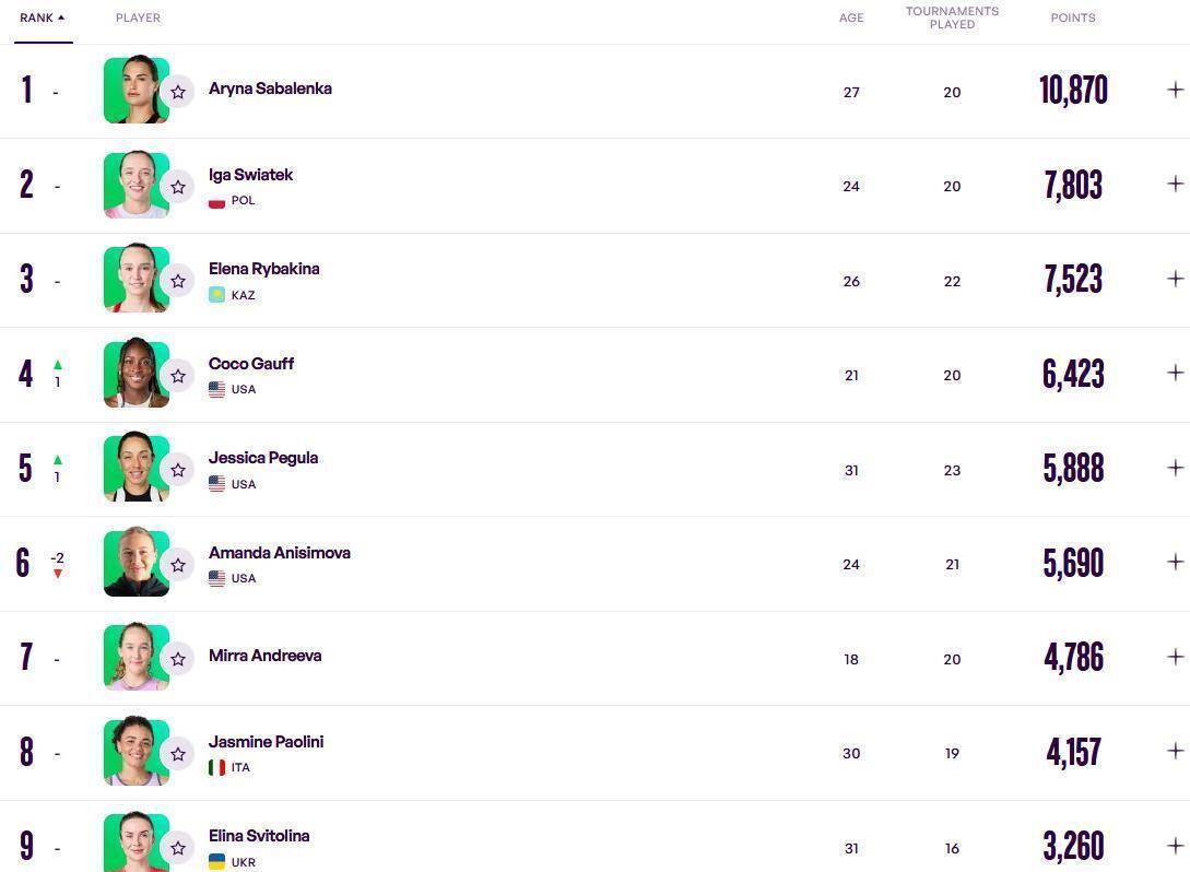 美国军团在TOP10中占据了三个席位,高芙升至第4位,佩古拉升至第5位,阿尼西莫娃则跌至第6位。 俄罗斯小将安德列娃、意大利的鲍里妮、乌克兰的斯维托丽娜分列第7至第9位。